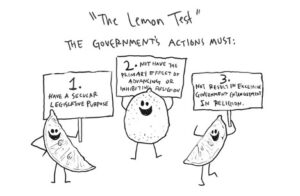 Along the way, the Court developed what became known as the “Lemon Test,” first applied by the Court in Lemon v. Kurtzman (1971). The “Lemon Test” consists of three prongs. For a law to be constitutional, it must (1) have a secular legislative purpose, (2) neither advance nor inhibit religion, and (3) avoid fostering “excessive government entanglement with religion.”