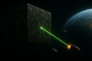 While Picard and Riker and Data and anyone else who’s going to survive scramble to come up with solutions, the Borg or their ilk confronts other planets or galaxies or whatnot which are far less advanced than even our hopeful heroes. Inevitably, however, these most minor of minor players send up their handful of tiny ships to attack the Big Bad.
